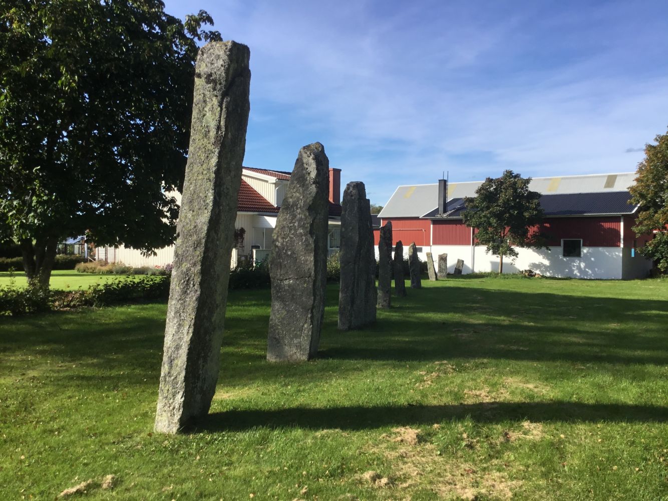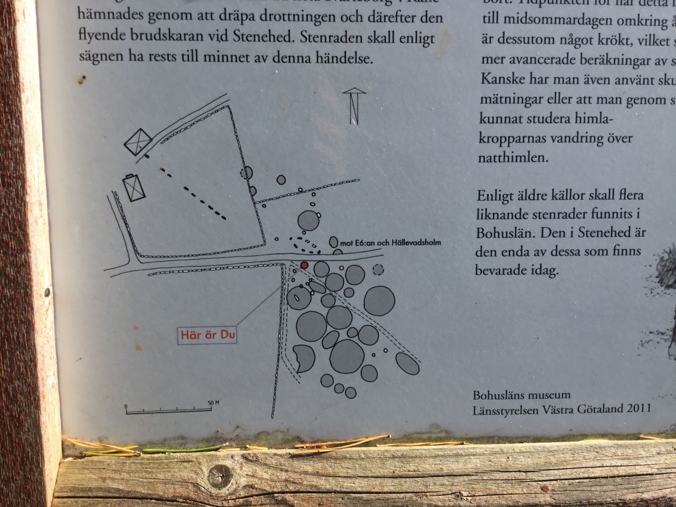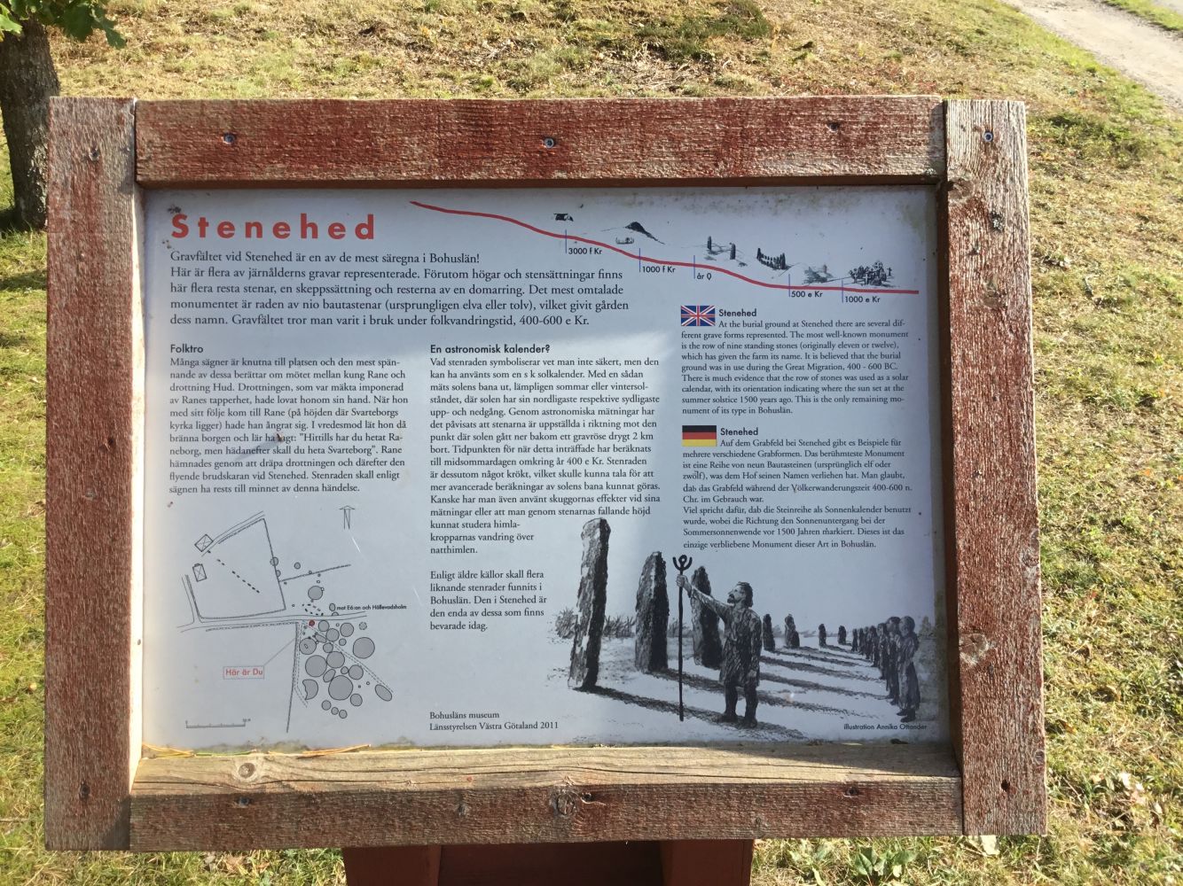 Förhistoriska kultplatser, astronomiska kalendrar eller gravmonument? Vid det storslagna järnåldersgravfältet Stenehed sydväst om samhället Hällevadsholm finns omkring fyrtio fornlämningar; högar, stensättningar, resta stenar, en domarring och en skeppssättning. På Stenehed ligger också en av våra märkligaste fornlämningar - nio bautastenar resta på en lång rad. Stenarna som ursprungligen varit elva eller tolv till antalet, ökar relativt jämt i höjd från knappt en och en halv meter i norr till dryga tre meter i söder. Det originella med bautastenarnsa på Stenehed är hur de har placerats. De står i en lång, något krökt rad där stenarna blir högre och högre i riktning från norr mot söder.